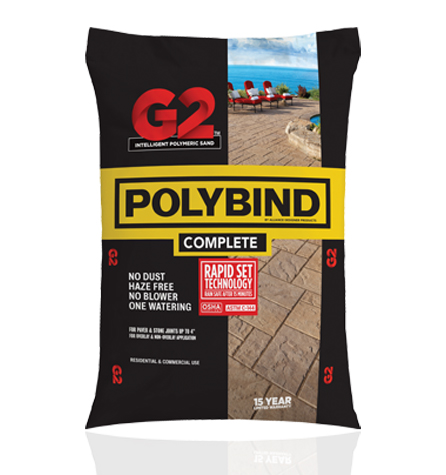 Polybind G2 COMPLETE Black brings a sleek, high-contrast finish to modern hardscape projects. Its bold color enhances the look of lighter pavers and natural stones, creating a striking visual effect. Formulated with G2 technology, this polymeric sand is dust-free, haze-free, and requires no blower for cleanup. It hardens after water activation to create a durable, flexible joint that locks pavers in place and prevents weed growth, insect infiltration, and erosion.